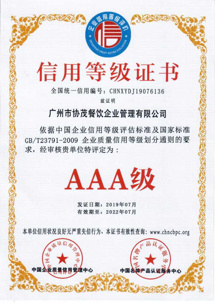 協茂秉承“星級管理,服務至上;立足廣東,服務全國”的經管理念;恪守“誠信、健康、營養”的服務理念;弘揚“品質至上,不斷創新”的企業精神,形成了獨有的“優質、快捷、客戶滿意”的服務標準。科學的管理、人性的服務、嚴密的體制鑄就了協茂口碑。